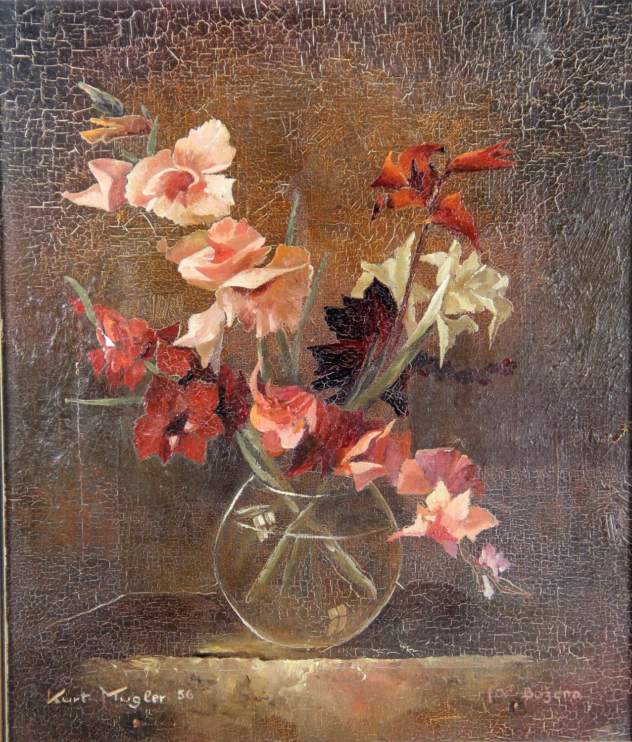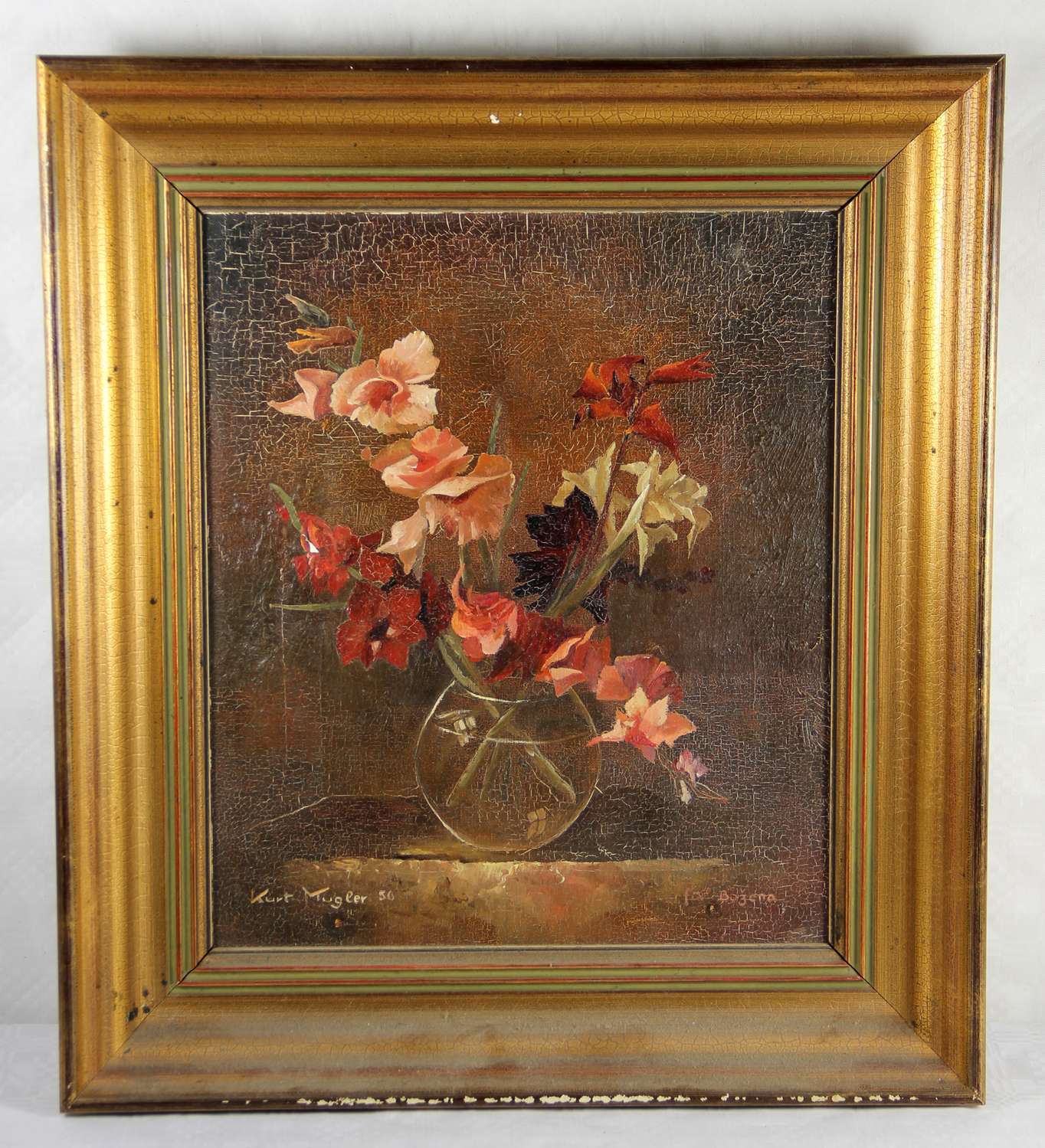 Mitte 20. Jhd., Blumen in einer Glasvase, unten links signiert mit Kurt Mugler 56, unten rechts Widmung, Öl/Lw., rest., H. 34, B. 29, Ra.
